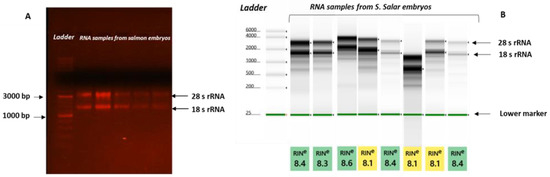 As discussed in the introductory section, RNA extraction from salmon eggs is very difficult, and in this study, we isolated the embryonic cells by dechorionation. The immersion in acetic acid made the eggs transparent, facilitating easy cell collection, while centrifugation in PBS did not alter cellular physiology. Agarose gel electrophoresis results demonstrated the two bands, i.e., 28s rRNA and 18s rRNA, which is an indicator of high-quality and intact RNA [64]. The RIN quantifies the fragmentation of the RNA sample [65], and high-quality RNA should fall in the range of a value of eight. In the present study, the RIN value was more than eight, which indicates that the isolated RNA had good integrity.