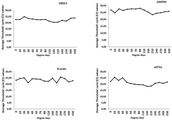 The most important step for the analysis of quantitative polymerase chain reaction (qPCR) data is normalization with the proper housekeeping gene (HKG) to eliminate pre-PCR and PCR processing variations [23,24]. The choice of an appropriate HKG is crucial for accurate and reliable results in qPCR analysis, as any variability or bias in their expression can affect the normalization and interpretation of the target gene expression. An ideal reference gene should be constantly expressed in the testing samples to prevent erroneous results [25]. Often, however, HKGs under different experimental conditions or developmental stages show variable results [26,27]. It is advised to validate more than one HKG for the normalization of qPCR data to avoid misleading results [28,29]. By validating housekeeping genes, we can ensure the reliability and reproducibility of qPCR experiments and minimize the risk of misinterpreting gene expression data.