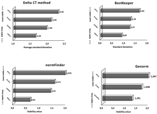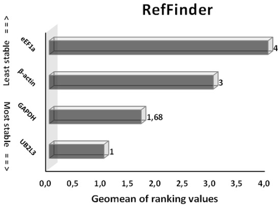 Similarly, geNorm calculates the stability value and ranks the reference genes accordingly. The lowest value indicates more stability, and, in our case, UB2L3 and GAPDH showed a similar lowest value (1.291), indicating that they were more stable candidate reference genes than β-actin (1.698) and eEf1a (1.997). The stability analysis calculated by the delta CT method, BestKeeper, NormFinder and geNorm algorithms is presented in Figure 3.