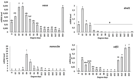 Basal mRNA transcript level of PGC genes: vasa, dnd1, nanos3a and sdf1 during developmental stages of S. salar. Data are presented as mean ± SD (n = 4). Bars with different superscripts denote statistically significant differences (p < 0.05) between developmental stages. 0: unfertilized egg and 430: yolk sac fry or alevins.