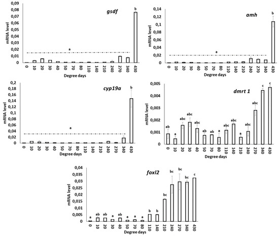 The expression of amh was not detected until 210 d°C, after which it was expressed in the subsequent stages analyzed in this study. Significantly higher (p < 0.05) expression was observed at 430 d°C.
