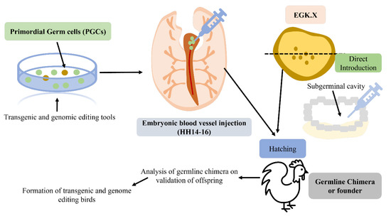 - Lee, H.J.; Lee, H.C.; Han, J.Y. Germline Modification and Engineering in Avian Species. Mol. Cells 2015, 38, 743–749. [Google Scholar] [CrossRef]