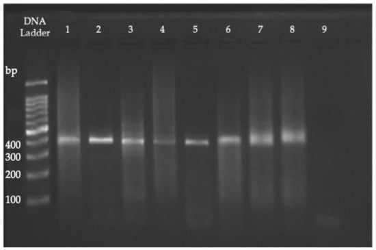 Amplicons of 384 bp in size from the second PCR reaction (G. duodenalis). Lane 1 corresponds to control; lanes 2–8 correspond to the pools analyzed; lane 9 corresponds to the negative control.