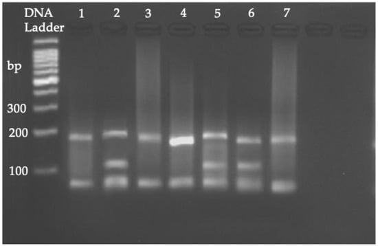 RFLP analysis of a 384 bp fragment of the β-giardin gene (G. duodenalis). Lanes 2, 5, and 6 correspond to the AI assemblage (190, 100 and 70 bp) and lanes 1, 3, 4, and 7 correspond to the AII assemblage (210 and 70 bp).