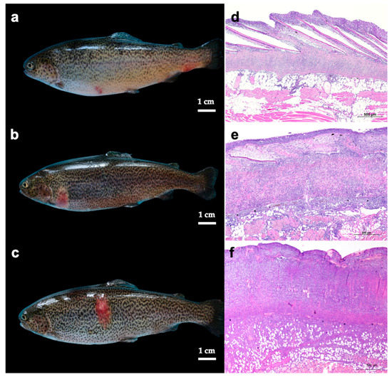- Galeotti, M.; Sarli, G.; Sirri, R.; Mandrioli, L.; Beraldo, P.; Bronzatti, P.; Giavenni, R.; Orioles, M.; Magi, G.; Volpatti, D. Red mark syndrome of trout ( Oncorhynchus mykiss ; Walbaum, 1792): Histopathological scoring and correlation with gross lesions. J. Fish Dis. 2021, 44, 1325–1336. [Google Scholar] [CrossRef] [PubMed]