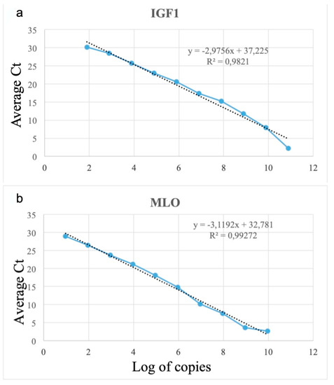 (a,b): (a) Standard curve of SYBR, green-based RT-qPCR amplification of plasmid containing IGF segment and Midichloriaceae-like organism (a) Standard curve, was plotted between mean Ct values obtained from each dilution of standard plasmid IGF against calculated log copy number (slope = 2.9756, R2 = 0.9821). (b) Standard plasmid with MLO fragment against estimated log copy number (slope = 3.1192, R2 = 0.9927).