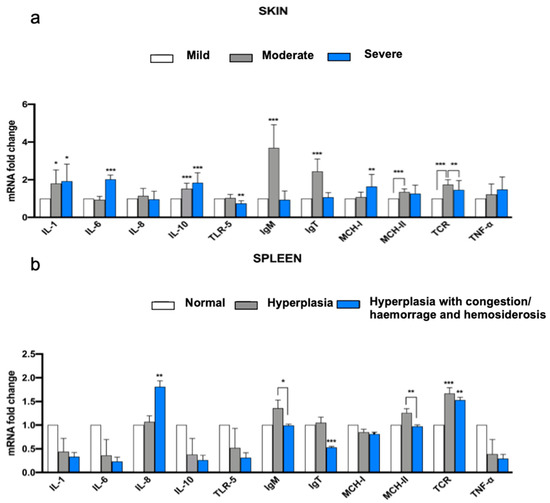 Fold change ratio in relative RNA expression of immuno-related genes analyzed in the skin (a) and splenic (b) samples. Skin and splenic samples were divided into groups based on the histological categories of the skin and splenic lesions (respectively, “Mild”, “Moderate” or “Severe” for skin and “Normal”, “Hyperplastic” and “Hyperplastic with congestion/haemorrhage and hemosiderosis” for spleen). “Mild” and “Normal” groups are the reference groups (gene expression = 1; white column) for skin and spleen samples, respectively. * = p < 0.1; ** = p < 0.05; *** = p < 0.01.