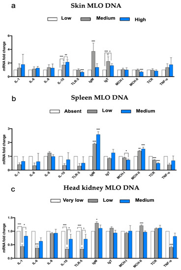 (a–c): Fold change ratio in relative RNA expression of immuno-related genes analyzed in the skin (a), spleen (b), and kidney (c) in relation to samples classified by their MLO DNA content. * = p < 0.1; ** = p < 0.05; *** = p < 0.01.