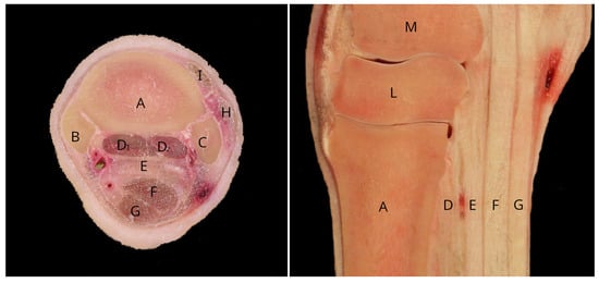 Cross-sectional (left) and sagittal (right) anatomical specimens of the proximal metacarpal region. (A) third metacarpal bone; (B) second metacarpal bone; (C) fourth metacarpal bone; (D1) medial lobe of the suspensory ligament; (D2) lateral lobe of the suspensory ligament; (E) accessory ligament of the deep digital flexor tendon; (F) deep digital flexor tendon; (G) superficial digital flexor tendon; (H) lateral digital extensor tendon; (I) common digital extensor tendon; (L) third carpal bone; (M) intermediate carpal bone.