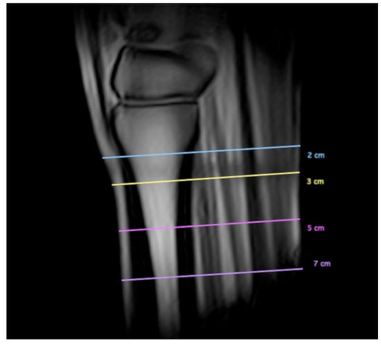 Midline sagittal image from the pilot scan, depicting how the levels were set at 2, 3, 5, and 7 cm distal to the carpometacarpal joint, perpendicular to the suspensory ligament.