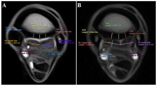 Measurements were acquired by a single analyst (IL) who received prior training from an experienced assessor (AN, Diplomate of the American and European Colleges of Veterinary Sports Medicine and Rehabilitation, with 15 years of experience in MR image interpretation). Measurements were acquired in T1-weighted GRE transverse MR images at 2, 3, 5, and 7 cm distal to the carpometacarpal joint (CMCJ). The levels were set using a midline sagittal image for cross-referencing (Figure 2). The palmar cortical thickness of McIII was measured at 25%, 50%, and 75% of its mediolateral width (Figure 3A,B). Measurements were obtained perpendicular to the palmar contour of the cortex. The overall palmar cortical thickness was calculated, using Microsoft Excel (Microsoft Corp., 2019; Redmond, Washington, DC, USA), as the mean of the measurements obtained at 25%, 50%, and 75% of the mediolateral width of the PcMcIII, for each level, respectively. Maximum mediolateral width and dorsopalmar depth were measured for each lobe of the SL or for the entire SL, where the lobes could not be distinguished. Dorsopalmar depth was measured as the greatest distance between the dorsal and palmar margins of the ligament, obtained perpendicular to its palmar margin. The mediolateral width was measured as the greatest distance between the medial and lateral margins of the ligament (Figure 3A,B). At 2 cm distal to the CMCJ, the margins of the SL cm were poorly defined in most limbs, and dorsopalmar depth and mediolateral width measurements could not be obtained reliably. Suspensory ligament measurements obtained at this level were therefore excluded from the analysis. All measurements were performed in a dedicated medical image viewer software (Horos Project; https://horosproject.org, accessed on 1 May 2021).