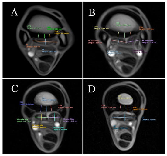 Transverse low-field T1-weighted gradient echo magnetic resonance images of an experienced endurance horse were obtained at 2 cm (A), 3 cm (B), 5 cm (C), and 7 cm (D) distal to the carpometacarpal joint. Medial is to the left and dorsal is to the top. (ML) mediolateral width; (DP) dorsopalmar depth; and (25, 50, 75%) palmar cortical thickness from medial to lateral.