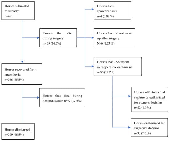 To evaluate the risk factors that could influence short-term survival, only hospitalized horses were included because the criteria for defining an inoperable subject are subjective and thus can vary greatly between centres and surgeons. Furthermore, the data of animals that underwent intraoperative euthanasia for economic reasons were excluded because these could be confounding factors.