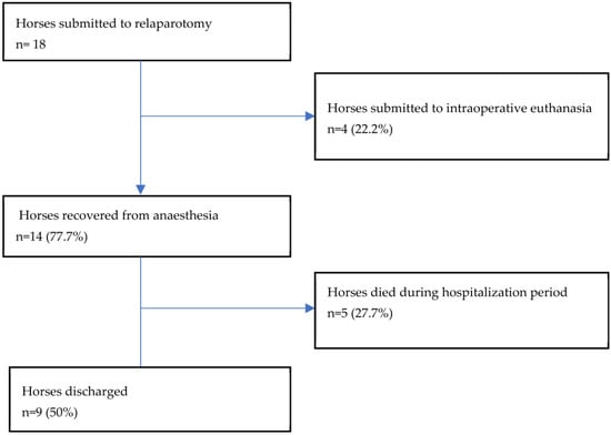 - Iglesias-García, M.; Rodríguez Hurtado, I.; Ortiz-Díez, G.; De la Calle Del Barrio, J.; Fernández Pérez, C.; Gómez Lucas, R. Predictive Models for Equine Emergency Exploratory Laparotomy in Spain: Pre-, Intra-, and Post-Operative-Mortality-Associated Factors. Animals 2022, 12, 1375. [Google Scholar] [CrossRef] [PubMed]