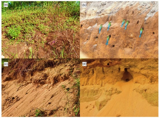 Different types of sand walls. (a) Before sand-digging activities, this sand wall was covered by vegetation, making it unsuitable for nesting by blue-tailed bee-eaters (Merops philippinus). (b) Sand digging resulted in a bare and vertical slope where bee-eaters could easily excavate breeding cavities. (c) After 1 or 2 years of abandonment and no sand digging, the sand wall became too loose for cave excavation due to rainwater and wind erosion. (d) A sand wall with bee-eater breeding cavities, destroyed by exploitative sand digging.