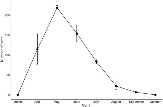 We investigated the number of bee-eaters at the six study sites twice a month, from March to October. We used binoculars Swarovski EL 10 × 32 WB to observe and count all individuals of bee-eaters in each study site. Because the bee-eaters become colonies around the sand walls during breeding season, it was feasible to count all individuals in the study sites. The numbers of bee-eaters at the six study sites were counted at the same time to avoid repeat counts between study sites. For each study site, the largest number that was counted during the course of the investigation was used to represent the number of birds. According to our investigations, the bee-eaters began visiting the sand walls in April and reached peak breeding numbers in May of the same year (Figure 2). Therefore, we used the number of birds in May of every year as a representation of the year. We also noted the status of nesting habitats (i.e., whether they were destroyed by the exploitative sand digging) during the investigation.