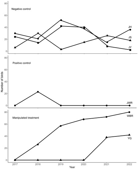 The results of MCMC-GLMM and logistic regression were consistent with the observations. Both the treatment and year significantly predicted the number of birds (Treatment: P-MCMC = 0.004, Year: P-MCMC = 0.026, MCMC-GLMM; Table 2), indicating that the number of birds differed among different treatments and years. The interaction between the treatment and year was also significant (Table 2); thus, the number of birds in each year varied with different treatments. Further logistic regression analyses revealed that both the group and interaction between the group and year significantly predicted the number of birds (Group: Z = −5.36, P < 0.001, Group × Year: Z = 5.35, P < 0.001, Logistic Regression; Table 3). This implies that the year-to-year changes in the number of birds differed between different groups.