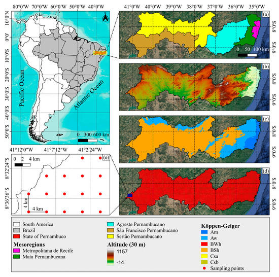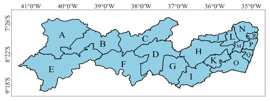 This study was carried out in Pernambuco state—inserted in the NEB region, which covers an area of 98,312 km2, situated between the parallels of 7°15′45″ and 9°28′18″ S and the meridians of 34°48′35″ and 41°19′54″ W. According to the Köppen–Geiger climate classification, the region’s climate divides into the following six classes: Am (humid tropical climate); Aw (tropical savanna climate with a dry winter season); BWh (hot arid climate); BSh (hot semiarid tropical climate with a defined dry season); Csa (hot summer Mediterranean climate); and Csb (cool summer Mediterranean climate) (Figure 1) [35].