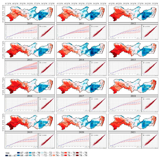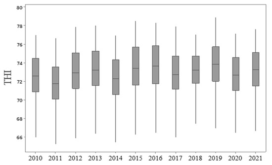 Table 1 presents descriptive statistics of annual THI values for the studied years, based on a general average. The CV was considered low (<24%) for all the years evaluated [44], indicating a high homogeneity of the data. As the mean and median values were similar, a behavior verified for all years evaluated in the present study (Table 1), the data were assumed as presenting normality, in accordance with Silva et al. [43,58].