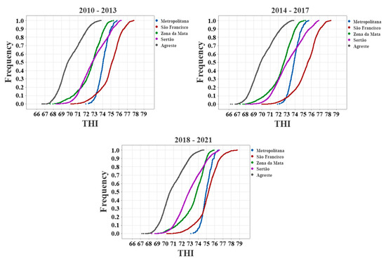 Cumulative distribution functions of the four-year THI values in Pernambuco state.