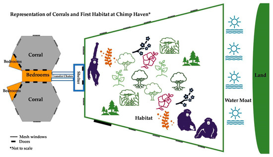 In the wild, chimpanzees live in large flexible groups of 20 to 100 or more individuals that occupy territories typically ranging from 5 km2 to 27 km2, although some territories may even extend to 300 km2 [1,2,3,4,5]. Within these large territories and the fission–fusion social organization of their groups, individuals climb, travel, rest, make nests, utilize tools, and forage for food. They also interact with each other through mating, cooperative hunting, foraging, grooming, and patrolling the boundaries of these territories. Wild chimpanzees use both arboreal and terrestrial spaces within their habitats. In the wild, chimpanzees of both sexes also typically spend their time in proximity to familiar group mates [6,7]; however, they may distance themselves from unfamiliar chimpanzees or even seek out and attack strangers [8,9,10]. The environment of wild chimpanzees is different from typical North American climates in that they live in climates near the equator where the temperatures remain warmer and relatively steady throughout the year [11,12], whereas North American climates experience seasonal fluctuations where temperatures range from cold in the winter months to hot and humid in the summer months.