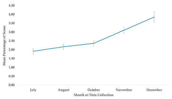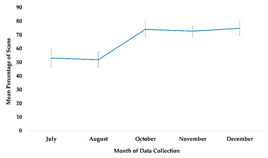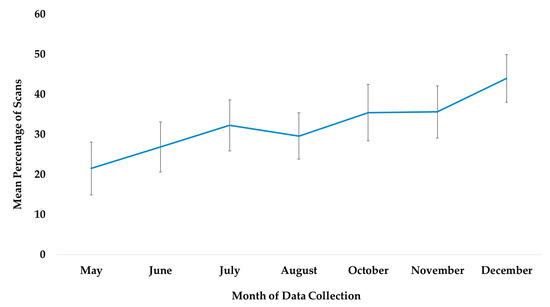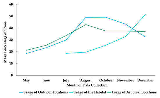 Mean percentage of scans of overall use of indoor arboreal space from May to December. No data collection occurred during the month of September.