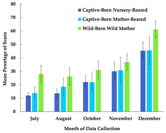 Mean percentage of scans that captive-born nursery-reared, captive-born mother-reared, and wild-born chimpanzees utilized the habitat from July to December. No data collection occurred during the month of September.