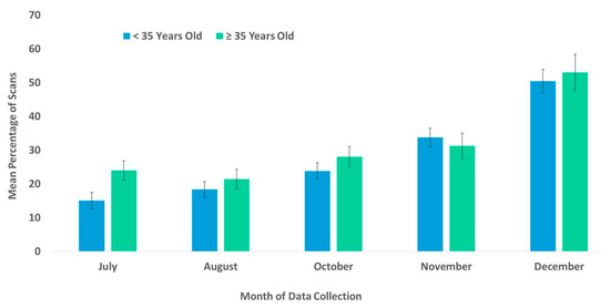 A total of 35,756 (SD ± 6.6) scans were collected during the entire study (May: n = 3123; June: n = 7542; July: n = 6425; August: n = 5328; October: n = 4842; November: n = 4500; December: n = 3942). We collected a total of 1988 scans for 17 subjects, and 1960 for one subject. Our analyses resulted in significant results in multiple categories. First, we discuss the main results in each category and then we discuss the complete results in more detail (Table 2).