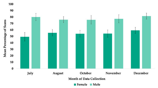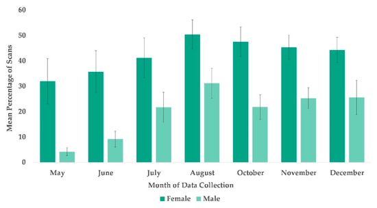 Mean percentage of scans that female and male chimpanzees used arboreal space from May to December. No data collection occurred during the month of September.