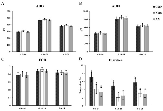 Effects of xylo-oligosaccharides and arabinoxylans on growth performance of weaned pigs. Note: (A) ADG, average daily gain; (B) ADFI, average daily feed intake; (C) FCR, feed conversion ratio; (D) diarrhea. Note: a, b, significant differences (p < 0.05) between different letters in the same row of shoulder labels (n = 6); CON, a control diet; XOS, a diet containing 1% xylo-oligosaccharide; AX, a diet containing 1% arabinoxylans; SEM, standard error of the mean.