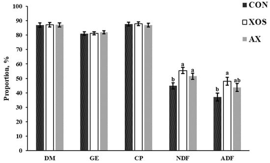 Effects of xylo-oligosaccharides and arabinoxylans on apparent total tract digestibility of dietary nutrients in weaned pigs. Note: a,b significant differences (p < 0.05) between different letters in the same row of shoulder labels (n = 6); CON, a control diet; XOS, a diet containing 1% xylo-oligosaccharide; AX, a diet containing 1% arabinoxylans; SEM, standard error of the mean. DM, dry matter; GE, gross energy; CP, crude protein; NDF, neutral detergent fiber; ADF, acid detergent fiber.