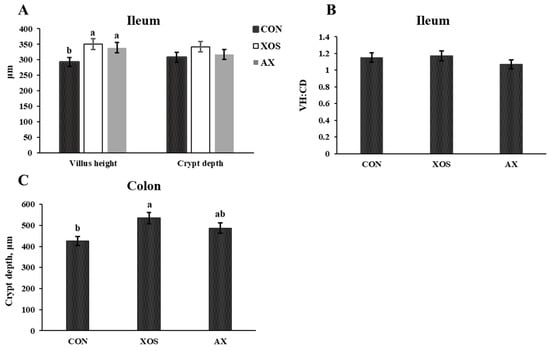 Effects of xylo-oligosaccharides and arabinoxylans on intestinal morphology in the ileum and colon of weaned pigs. Note: (A) villus height and crypt depth of the ileum; (B) VH: CD of the jejunum; (C) crypt depth of the colon. a, b Significant differences (p < 0.05) between different letters in the same row of shoulder labels (n = 6); CON, a control diet; XOS, a diet containing 1% xylo-oligosaccharide; AX, a diet containing 1% arabinoxylans; SEM, standard error of the mean.