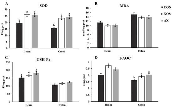 As shown in Figure 4, the addition of XOS or AX to the diet significantly increased the activity of SOD and GSH-PX in the ileum of weaned piglets compared with the CON group (p < 0.05). The colonic SOD and T-AOC activities in the XOS and AX groups were significantly greater than those in the CON group (p < 0.05).