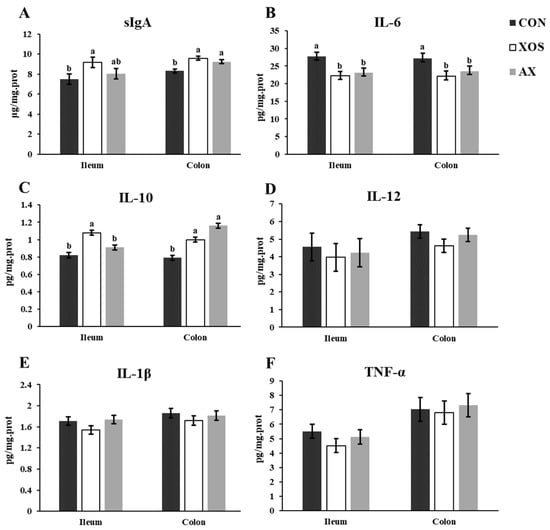 Effects of xylo-oligosaccharides and arabinoxylans on intestinal immune function of weaned piglets. Note: (A) secretory immunoglobulin A (sIgA); (B) interleukin 6 (IL-6); (C) interleukin 10 (IL-10); (D)interleukin 12 (IL-12); (E) interleukin 1β (IL-1β); (F) tumor necrosis factor α (TNF-α). a, b Significant differences (p < 0.05) between different letters in the same row of shoulder labels (n = 6); CON, a control diet; XOS, a diet containing 1% xylo-oligosaccharide; AX, a diet containing 1% arabinoxylans; SEM, standard error of the mean.