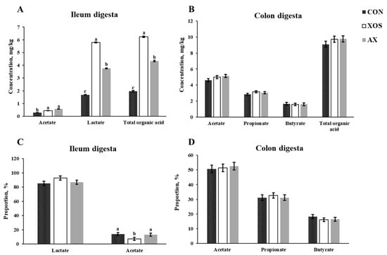 Effects of xylo-oligosaccharides and arabinoxylans on content of organic acids in the intestine of weaned pigs. Note: (A) ileum digesta; (B) colon digesta; (C) ileum digesta; (D) colon digesta. a–c Significant differences (p < 0.05) between different letters in the same row of shoulder labels (n = 6); CON, a control diet; XOS, a diet containing 1% xylo-oligosaccharide; AX, a diet containing 1% arabinoxylans; SEM, standard error of the mean.