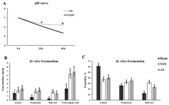Effects of in vitro fermentation of xylo-oligosaccharides and arabinoxylans on pH and SCFA concentrations. Note: (A) pH; (B) in vitro fermentation of SCFA concentration; (C) in vitro fermentation of SCFA proportion. a, b Significant differences (p < 0.05) between different letters in the same row of shoulder labels (n = 6); XOS, xylo-oligosaccharide; AX, arabinoxylans; SEM, standard error of the mean.
