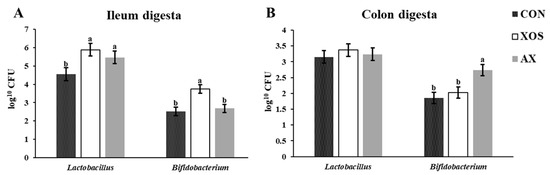 In the present study, the addition of XOS or AX to the diet significantly increased the contents of lactic acid, acetic acid, and total organic acids in the ileum of weaned piglets. Similarly, in vitro fermentation of AX or XOS significantly increased the contents of acetic acid, propionic acid, butyric acid, and total organic acids, and the proportions of propionic acid and butyric acid to total organic acid were greater in the AX and XOS groups than those in the control group. In addition, in vitro fermentation of XOS showed a faster reduction of pH than the AX in the present study, which indicated XOS with a smaller molecular mass and a lower polymerization can be fermented by gut microbiota quickly compared with the AX. In addition, there were no differences in the concentrations of SCFA between the in vitro assays of the XOS and AX groups, which was associated with the fermentibility of XOS and AX whereby both XOS and AX can be almost fully fermented by gut microbiota in vitro [36,37].