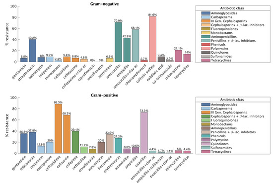 Percentage of gram-negative (upper panel) and gram-positive (lower panel) strains resistant to specific molecules.