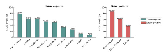 Percentage of multi-drug-resistant (MDR) strains in Gram-negative (left panel) and Gram-positive (right panel) bacterial genera.