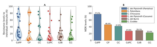 (A) Resistance levels to individual molecules and (B) percentage of multi-drug resistant (MDR) strains at different sites. Figure legend: GdPP = Grotta dei Pipistrelli (Pantalica), GP = Grotta Palombara, GC = Grotta Chiusazza, GdPC = Grotta dei Pipistrelli (Cassano), GdB = Grotta del Burrò, GG = Greve Grubbo.