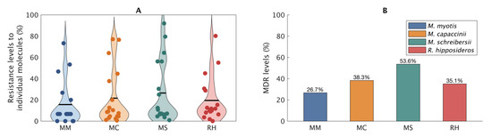 The levels of resistance against individual molecules and the levels of MDR found in different species are shown in the left and right panels of Figure 4, respectively. While M. schreibersii displayed the highest levels of MDR (53.6%), no pairwise comparison between species using the chi-square test indicated any significant differences in MDR levels ( for all individual comparisons).