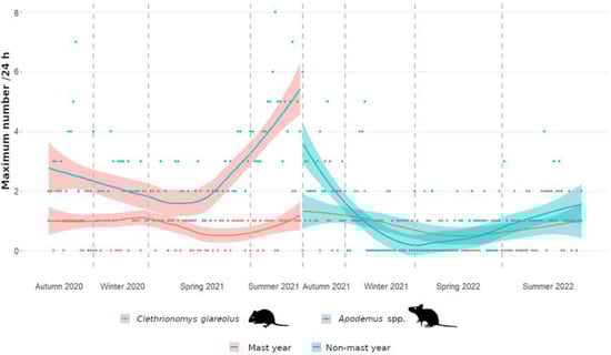 An important prerequisite for comparing the activity patterns of bank voles and Apodemus mice is the variation in frequency. Small forest rodents show the greatest population changes in the context of masting, especially among temperate tree species. Masting is the pulsed, synchronous production of large seed crops, which can dramatically affect the consumer community [,,]. Populations of Apodemus mice show a pronounced outbreak–crash pattern in response to the seed masts []. The findings are less clear for the more generalist bank vole [,,,], where cyclic, stable and intermediate population dynamics have been found across Europe []. The first year of our study was characterised by an extreme number of pollen not yet observed in the 30-year recording history of the Austrian federal state of Carinthia []. This was especially true for locally dominating woody plants, such as the Norway spruce, Picea abies, European beech, Fagus sylvatica, and European hazelnut, Corylus avellana. The positive connection between airborne pollen and quantity, as well as quality of seed crop in these so-called masting pollen producers could be proven elsewhere [,,,]. The second year of the investigation was characterized by a nil crop. In accordance with these particular differences in the availability of plant seeds, we will hereafter refer to the first year as the mast year and the second as the non-mast year.