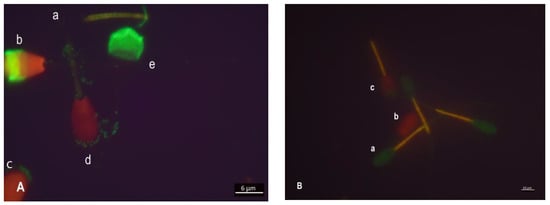 The mitochondrial activity was evaluated by examining the mitochondrial membrane potential (MMP) of sperm with the use of JC-1 fluorochromes (Life Technologies Ltd., Grand Island, NY, USA) with PI, according to a previously described method [11,28]. Diluted sperm samples (200 μL) were incubated with 1 μL of JC-1 solution for 15 min at 37 °C. Next, 1 μL of PI was added to the samples, which were incubated again for 5 min at 37 °C. The analysis revealed the presence of sperm with orange midpieces (with active mitochondria, high MMP) and sperm with green midpieces or unstained, often with red fluorescence in the head region (low MMP) (Figure 1B).