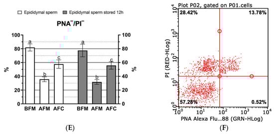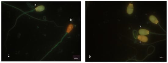 The acrosomal status of spermatozoa was evaluated using fluorescein isothiocyanate-labeled peanut (Arachis hypogaea) agglutinin (FITC-PNA; Life Technologies Ltd., Grand Island, NY, USA) with a PI solution. The method was described in earlier reports [11,28]. Next, 1 µL of JC-1 (1 mg JC-1/mL anhydrous dimethyl sulfoxide, DMSO) was added to diluted sperm samples (200 μL), and they were incubated at 37 °C for 15 min (to identify all sperm cells under the fluorescence microscope). Then, 2 μL of FITC-PNA solution and 2 μL of PI were added to the samples, which were incubated again for 5 min at 37 °C. The FITC-PNA working solution was prepared by dissolving 2 mg of FITC-PNA in 1 mL of PBS. Four sperm populations were observed under the microscope: non-stained spermatozoa in the head region with fluorescence in the midpiece were classified as live sperm with intact acrosomes (FITC-PNA−/PI−); sperm with green-red fluorescence in the head (FITC-PNA+/PI+) were classified as early necrotic, acrosome-reacted sperm; sperm with a red head were considered as dead; and a small population of spermatozoa had only green staining of the acrosomal cap (acrosome-reacted sperm) (Figure 1A).