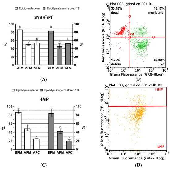 Sperm mitochondrial activity was determined by JC-1 and PI staining. A 3 mM stock solution of JC-1 in DMSO was prepared. Diluted sperm samples (500 μL) with a concentration of 50 × 106 cells/mL were combined with 0.67 μL of JC-1. Before analysis, the probes were incubated for 20 min, in the dark, at 37 °C [30]. Sperm emitting orange fluorescence were categorized as cells with high mitochondrial potential (HMP), whereas sperm emitting green fluorescence were classified as cells with low mitochondrial potential (LMP).