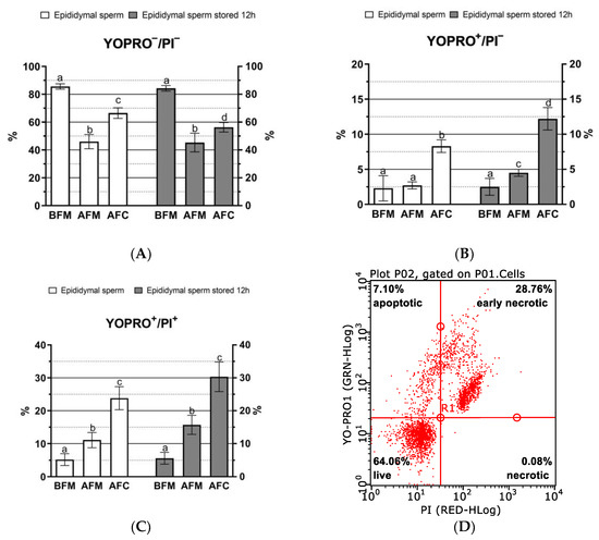 The Vybrant Apoptosis Assay Kit #4 (Life Technologies Ltd., Grand Island, NY, USA) was used to assess apoptosis and membrane integrity according to a previously described method [11,28]. First, to visualize all cells under a fluorescence microscope, the diluted samples (200 µL) were stained with 1 µL JC-1 (as described above). Then, 2 μL of YO-PRO-1 and 2 μL of PI were added to the samples, which were incubated at 37 °C for 5 min. Four sperm populations were distinguished in the fluorescence analysis: viable sperm (YO-PRO-1−/PI−), sperm showing apoptotic-like changes (YO-PRO-1+/PI−), sperm with early necrotic changes (YO-PRO-1+/PI+), and dead/necrotic sperm (YO-PRO-1−/PI+), according to a previously described staining model [11].