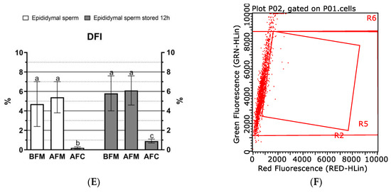 A similar relationship was observed in thawed sperm, excluding the percentage of normal spermatozoa without apoptotic changes (FC), the percentage of apoptotic-like spermatozoa (FM and FC) (Figure 3A,B), and DNA fragmentation (DFI, FC) (Figure 3E,F).