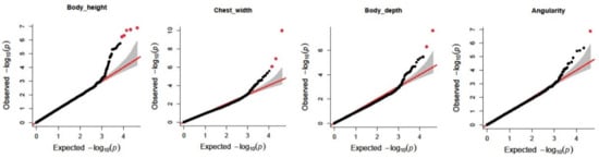 Quantile–quantile plots of GWAS for body size traits in Chinese Holstein cattle. The red lines (expected values) illustrate the null hypothesis of no true association. The observed values (black dots) are a deviation from this line. The grey shades illustrate the confidence interval of the p-value. The red dots represent the significant SNPs of the body size traits.