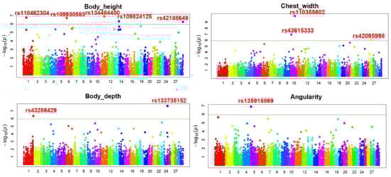 For over a decade, GWAS has become an effective approach for detecting genetic markers that are associated with multiple economic traits in animal production. Some GWASs on body size have been carried out across different populations in order to understand the genetic mechanisms of growth traits, such as Chinese Holstein cattle [], Simmental beef cattle in China [], and Brahman and Yunling cattle []. In addition, various SNPs, genes, and QTLs were related to body measurement, body weight, and conformation traits in different breeds [,,,]. Therefore, our study aims to identify SNPs associated with body size traits (body height, body depth, chest width, and angularity) using the GWAS approach. Furthermore, we conducted gene ontology and KEGG pathway analysis for a better understanding of the biological functions of the genes within the significant SNPs. The newly identified genetic markers and candidate genes may contribute to genomic selection and the genetic improvement of body size in Chinese Holstein dairy cows.