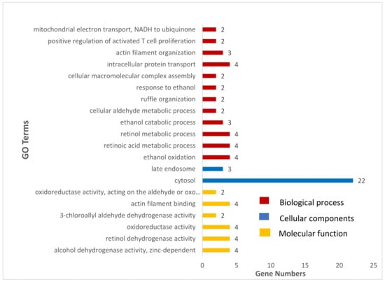 Various metabolic activities occur during an animal’s body growth and development, so it is reasonable that the metabolic pathways are one of the significantly enriched KEGG pathways in this study. In the present work, many GO terms (Table S2 and Figure 3) and KEGG pathways (Table 4) were significantly enriched (p ≤ 0.05). Among them, five pathways (metabolic pathways, fatty acid degradation, drug metabolism-cytochrome P450, metabolism of xenobiotics by cytochrome P450, and chemical carcinogenesis) were reported to be associated with residual feed intake in Australian Angus cattle []. Moreover, retinol metabolism was significantly over-represented in biological pathways involved in carcass trait performance in Holstein-Friesian cattle []. In contrast, histidine metabolism was significantly enriched in pathways related to mammary teat-shape conformation traits in Chinese Holstein cattle []. In addition, tyrosine metabolism and beta-alanine metabolism were identified as significant KEGG pathways of the differentially expressed genes in the Large White pigs [].